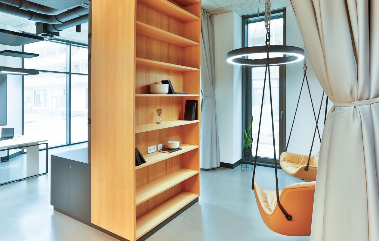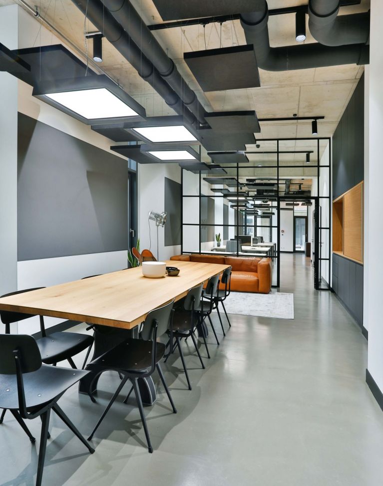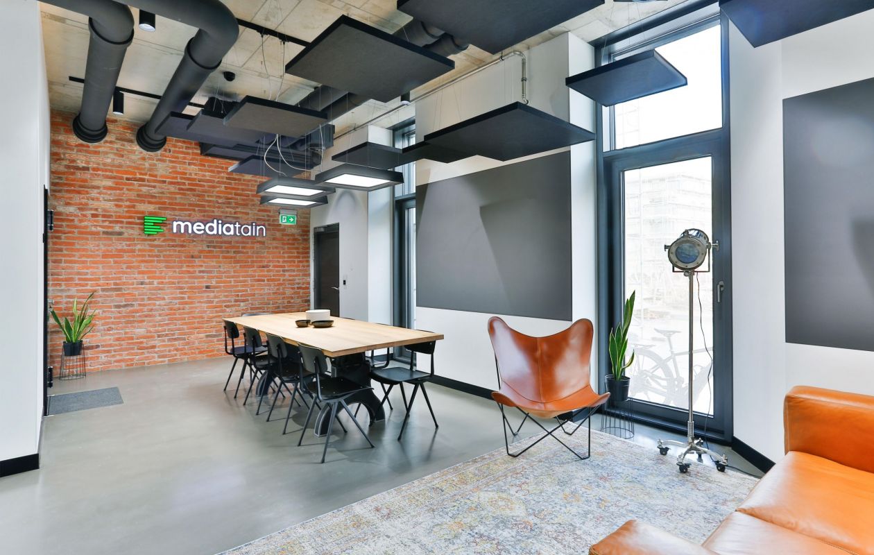 Die Digitalisierung verändert alles: Wie wir leben, wie wir arbeiten. Die damit einhergehende Umstellung von analogem zu digitalem Arbeiten kann mithilfe von digitalen Werkzeugen wie der Gamification erleichtert werden. Das Unternehmen Mediatain -2017 in Bamberg gegründet- entwirft in diesem Kontext effiziente und innovative Softwarelösungen unter Anwendung agiler Arbeitsmethoden. Unterstützt wird die Arbeit des Start-Ups durch die neu konzipierten Räumlichkeiten. Dabei spiegelt das neue Innenarchitekturkonzept in der ehemaligen Baumwollspinnerei sowohl die Philosophie und die moderne Arbeitsweise des zeitgemäßen Unternehmens als auch den industriellen Charme des geschichtsträchtigen Gebäudes wider. Im Eingangsbereich bilden die ursprünglichen Mauerwerkswände einen starken Kontrast zu Modernität und Materialität der Ausstattung. Diese Zone empfängt Besucher, ermöglicht ungestörte Besprechungen und ist mit einem flexiblen Begegnungsbereich inklusiv integrierter Teeküche für größere Meetings oder gemeinsame Pausen ausgestattet. Der Hauptraum bietet klassische Desksharing Arbeitsplätze, die auch für Coworking zur Verfügung stehen, sowie einen akustisch abtrennbaren informellen Rückzugsbereich. Ein separates Tonstudio und ein multifunktionaler Kinoraum komplettieren die Anforderungen der verschiedenen Arbeitsweisen.